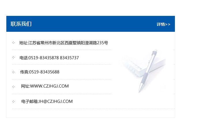 地址:常州市新北區友邦商務大廈1幢16、17層  電話:0519-85101652  傳真:0519-85112595  郵編:213022  網址:www_cz-jiayue_cn.lingyib2b.com  郵箱:xiajifengaa@163.com